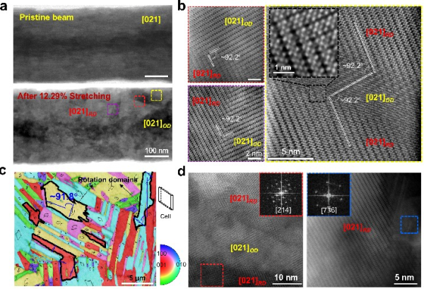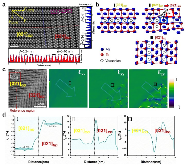 This research centers on Ag2Te, a high-performance near-room-temperature thermoelectric material. By in-situ scanning/transmission electron microscopy (S/TEM), the research team directly observes a new deformation mechanism in Ag2Te, namely ionic-hop-mediated domain rotation. The research results show that through stress-driven, the hopping of Ag ions to adjacent vacancies stabilizes the deformed Te-sublattice and facilitates a coordinated ~92.2° lattice rotation that accommodates substantial plastic strain. This mechanism preserves long-range crystallinity and excellent room-temperature plasticity in Ag2Te, with an average tensile strain of over 12%.